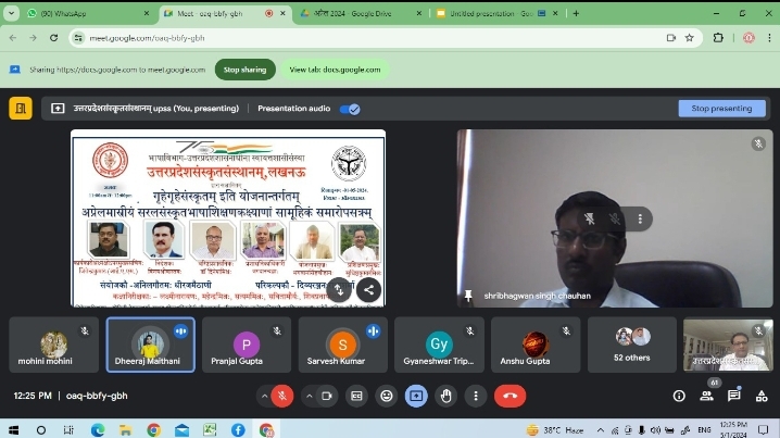 योजनारूप परिवार मुख्य सर्वदा अपि प्रेरणा देने वाले, समग्र सम्भाषण- योजना के सञ्चालन में चिन्तनशील क्रियान्वयन एवं प्रबन्धन में तत्परा गृहे-गृहे संस्कृतम् इति योजना के प्रमुख भगवानसिंहचौहान ने कहां कि इस योजना में अभी और परिश्रम की अपेक्षा हैं मैं सभी समन्वयकों से आग्रह करता हूं आप निरंतर कार्य करते रहे । योगप्रयोगपुरोहितादि में सतत तत्पर व्याकरणादिविषये कृतपरिश्रम संस्कृत भाषाविद्वान् कक्षाशिक्षण मार्गदर्शन जो करते रहते हैं ऐसे समन्वयक श्री दिव्यरंजन ने शिक्षकों द्वारा विहितकार्य की समीक्षा कर आगे अवधान पूर्वक शिक्षण करने हेतु निर्दिष्ट किया। नित्यनिरन्तर ऊर्जा स्फूर्ति के साथ संलग्न योजना के प्रदेश समन्वयक श्री अनिलगौतम ने सत्र में समागत पदाधिकारी केन्द्राध्यक्ष के लिए धन्यवादान् विज्ञापित किया। मोहिनी ने मंच संचालन किया। अन्त में सत्र की परिसमाप्ति हेतु नीतूसक्सेना ने शान्तिमन्त्र का पाठ किया। इस अवसर पर अतिथि पदाधिकारी समन्वयक, समुपस्थित संस्कृतानुरागी, शिक्षकबान्धव, कार्यालय से ऋषभ पाठक, शांतनु मिश्र, शिवम् गुप्ता इत्यादि सहित केंद्राध्यक्ष एवं छात्र छात्राएं उपस्थित रहीं।