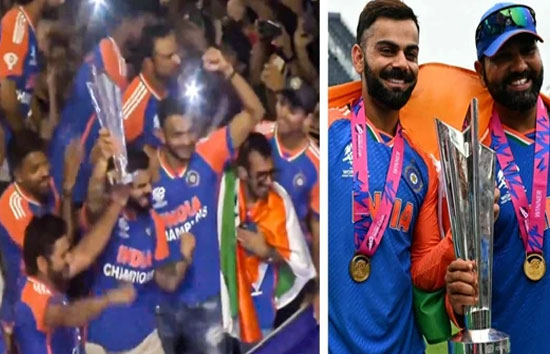 रोहित एंड कंपनी गुरुवार को बारबाडोस से स्वदेश पहुंची. दिल्ली लैंड करने के बाद भारतीय टीम ने सबसे पहले प्रधानमंत्री नरेंद्र मोदी से मुलाकात की. इसके बाद शाम को टीम इंडिया की विक्ट्री परेड मुंबई में नरीमन प्वॉइंट से लेकर वानखेड़े स्टेडियम तक आयोजित की गई. लाखों की संख्या में लोग अपने हीरो को देखने के लिए मरीन ड्राइव पर एकत्रित हुए. इस दौरान विराट कोहली और रोहित शर्मा ओपन बस में सबसे आगे आकर एक साथ विश्व कप ट्रॉफी को उठाकर फैंस को दिखाई. कोहली और रोहित को एक साथ देखकर फैंस में खुशी की लहर दौड़ गई. रोहित-विराट के ब्रोमांस का वीडियो सोशल मीडिया पर वायरल है.