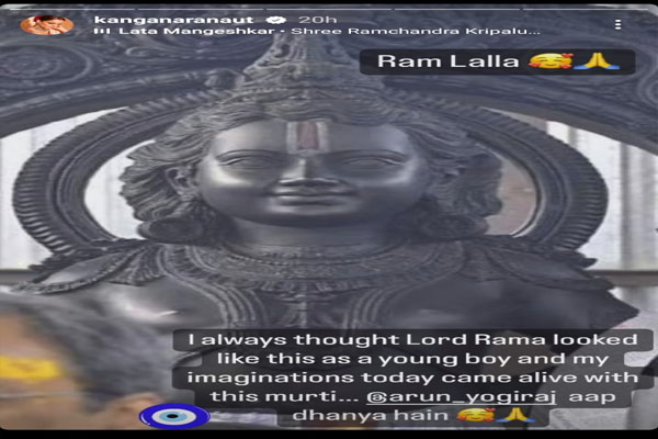 कंगना ने अपनी इंस्टाग्राम स्टोरीज में कहा कि मूर्ति बिल्कुल वैसी ही दिखती है जैसी उन्होंने भगवान के चेहरे की कल्पना की थी। 22 जनवरी को होने वाले प्राण प्रतिष्ठा समारोह से पहले गुरुवार को राम लला की मूर्ति को ‘जय श्री राम’ के उद्घोष के साथ राम मंदिर के गर्भ गृह में रखा गया।
