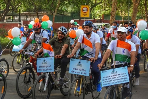 नई दिल्ली । विश्व साइकिल दिवस के अवसर पर केंद्रीय युवा मामले और खेल मंत्री अनुराग ठाकुर ने मेजर ध्यानचंद राष्ट्रीय स्टेडियम से साइकिल रैली के राष्ट्रव्यापी अभियान की शुरूआत की। उन्होंने करीब 700 युवा साइकिल चालकों के साथ राष्ट्रीय राजधानी में 7.5 किलोमीटर तक साइकिल चलाई। विश्व साइकिल दिवस शिक्षा को मजबूत करने, व्यायाम सहित बीमारियों को रोकने और सहिष्णुता को बढ़ावा देने के लिए मनाया जाता है। इस अवसर पर केंद्रीय मंत्री किरेन रिजिजू, मनसुख मंडाविया और मीनाक्षी लेखी भी मौजूद रहे।