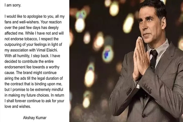 मुंबई । बॉलीवुड सुपरस्टार अक्षय कुमार ने नेटिजन्स से आलोचना के बाद तंबाकू विज्ञापन में शामिल होने के लिए माफी मांगी है।