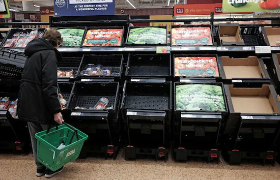 पूर्वी लंदन, लिवरपूल और ब्रिटेन के कई हिस्सों में दुकानों से पहले ही फल और सब्जियां गायब हैं। ब्रिटेन में सुपर मार्केट के प्रमुख प्रतिनिधि ब्रिटिश रिटेल कंसोर्टियम ने कहा कि आपूर्ति का मुद्दा काफी गंभीर हो गया है। सुपर मार्केट में खाली शेल्फ की तस्वीरें खूब वायरल हो रही हैं।