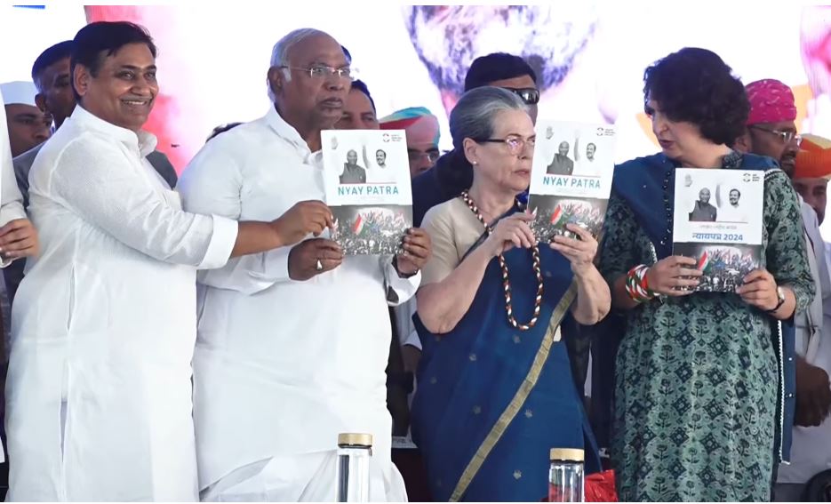 जयपुर। कांग्रेस संसदीय दल की अध्यक्ष सोनिया गांधी, कांग्रेस अध्यक्ष मल्लिकार्जुन खड़गे और पार्टी नेता प्रियंका गांधी वाड्रा ने जयपुर में पार्टी का घोषणापत्र ‘न्याय पत्र’ लॉन्च किया है। इस मौके पर सोनिया गांधी ने मोदी सरकार पर हमला करते हुए कहा मोदी सरकार द्वारा हमारे सविंधान को बदलने का षड्यंत्र रचा जा रहा वही देश का लोकतंत्र खतरे में है।