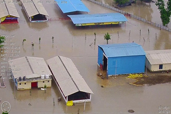 गौतमबुद्धनगर में लगातार पुलिस बल व एनडीआरएफ/फायर सर्विस टीम के साथ बाढ़ प्रभावित क्षेत्र सेक्टर-135 स्थित फार्म हाउस एरिया, गौशाला तथा आसपास के बाढ़ प्रभावित क्षेत्र में फंसे हुए व्यक्तियों व मवेशियों की सहायता करने के हरसंभव प्रयास किये जा रहे हैं। इसी क्रम में आसपास के क्षेत्र का “ड्रोन” से निरीक्षण किया जा रहा है, ताकि बाढ़ में फंसे व्यक्तियों एवं मवेशियों को देखकर रेस्क्यू किया जा सके।