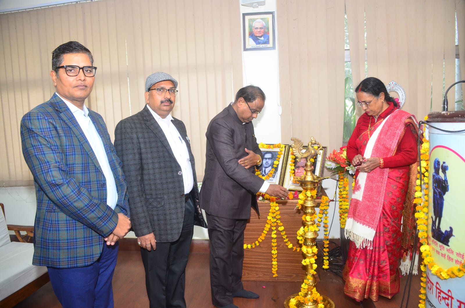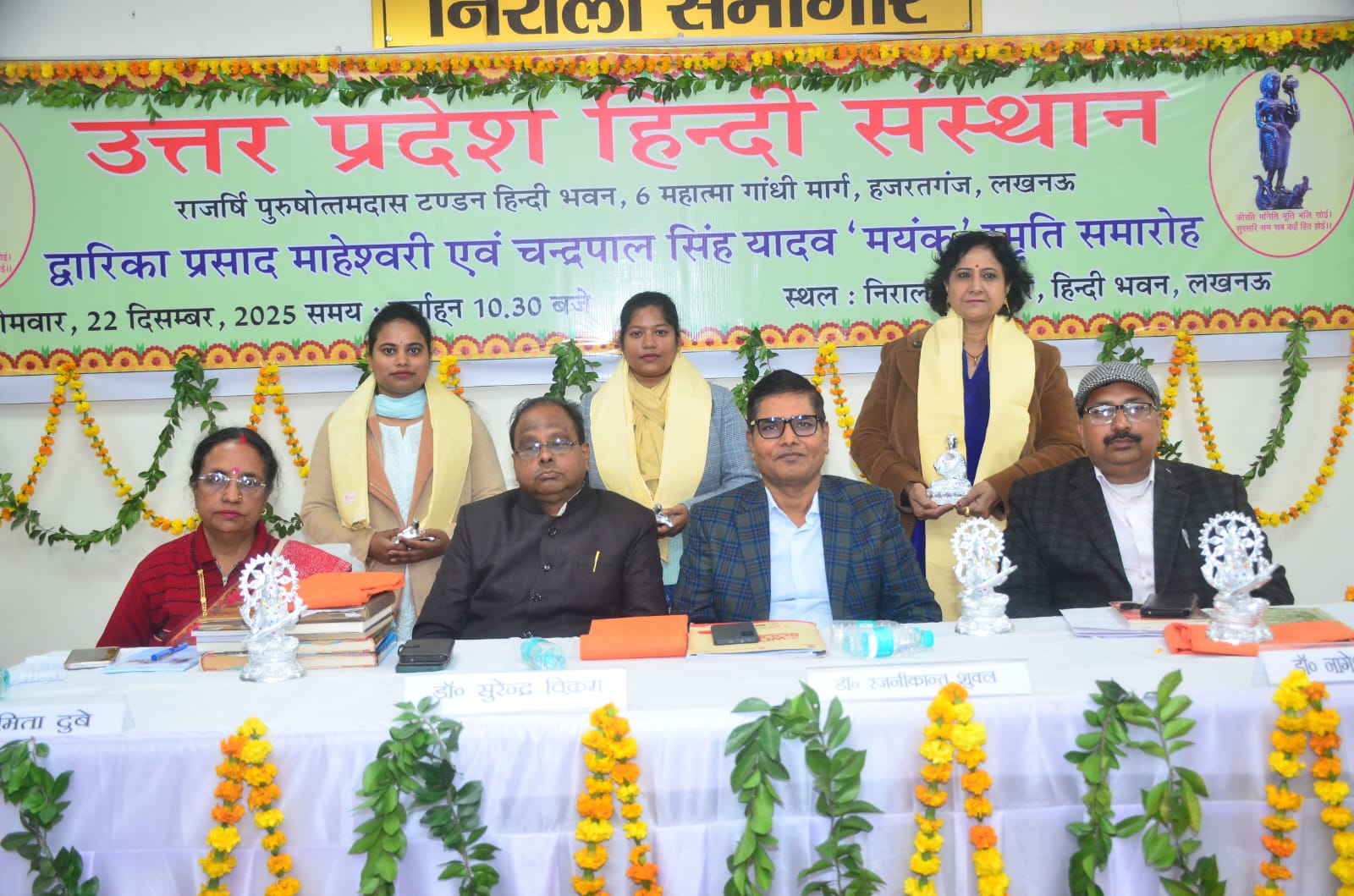 उत्तर प्रदेश हिन्दी संस्थान द्वारा द्वारिका प्रसाद माहेश्वरी एवं चन्द्रपाल सिंह यादव ‘मयंक’ स्मृति में सोमवार 22 दिसम्बर, 2025 को एक दिवसीय संगोष्ठी का आयोजन हिन्दी भवन के निराला सभागार लखनऊ में पूर्वाह्न 10.30 बजे से किया गया। दीप प्रज्वलन, माँ सरस्वती की प्रतिमा पर माल्यार्पण, पुष्पार्पण के उपरान्त वाणी वंदना सुश्री सरोज खुल्बे द्वारा प्रस्तुत की गयी। सम्माननीय अतिथि— डॉ० सुरेन्द्र विक्रम, डॉ0 नागेश पाण्डेय ‘संजय’ एवं डॉ० रजनीकान्त शुक्ल का स्वागत उत्तरीय एवं स्मृति चिह्न भेंट कर डॉ० अमिता दुबे, प्रधान सम्पादक, उत्तर प्रदेश हिन्दी संस्थान द्वारा किया गया ।