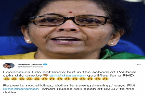 नई दिल्ली । निर्मला सीतारमण के उस बयान पर कटाक्ष करते हुए कि भारतीय मुद्रा फिसल नहीं रही है, डॉलर मजबूत हो रहा है, कांग्रेस के नेता ने सोमवार को कहा कि वित्त मंत्री अर्थशास्त्र में पीएचडी के लिए क्वालिफाई करती है। कांग्रेस सांसद मनीष तिवारी ने ट्वीट किया, “अर्थशास्त्र मैं नहीं जानता लेकिन सीतारमण राजनीतिक स्पिन के स्कूल में यह एक पीएचडी के लिए क्वालिफाई करती हैं। रुपया फिसल नहीं रहा है, डॉलर मजबूत हो रहा है। यह बयान एफएम सीतारमण कहती हैं जब रुपया 82.37 प्रति डॉलर पर है।”