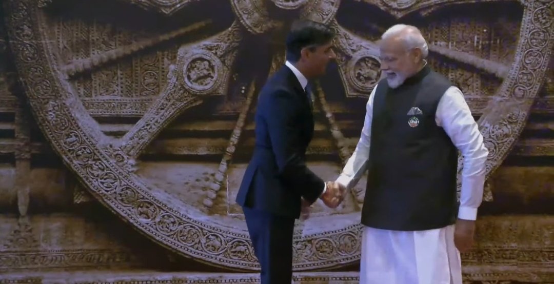 नई दिल्ली। प्रधानमंत्री नरेंद्र मोदी ने शनिवार को प्रगति मैदान में जी20 नेताओं के शिखर सम्मेलन के मुख्य स्थल भारत मंडपम में भाग लेने वाले सभी गणमान्यों का स्वागत किया।मोदी ओडिशा के कोणार्क स्थित सूर्य मंदिर के चक्र की एक विशाल छवि के सामने खड़े हुए और गर्मजोशी से हाथ मिलाते हुए नेताओं का स्वागत किया।