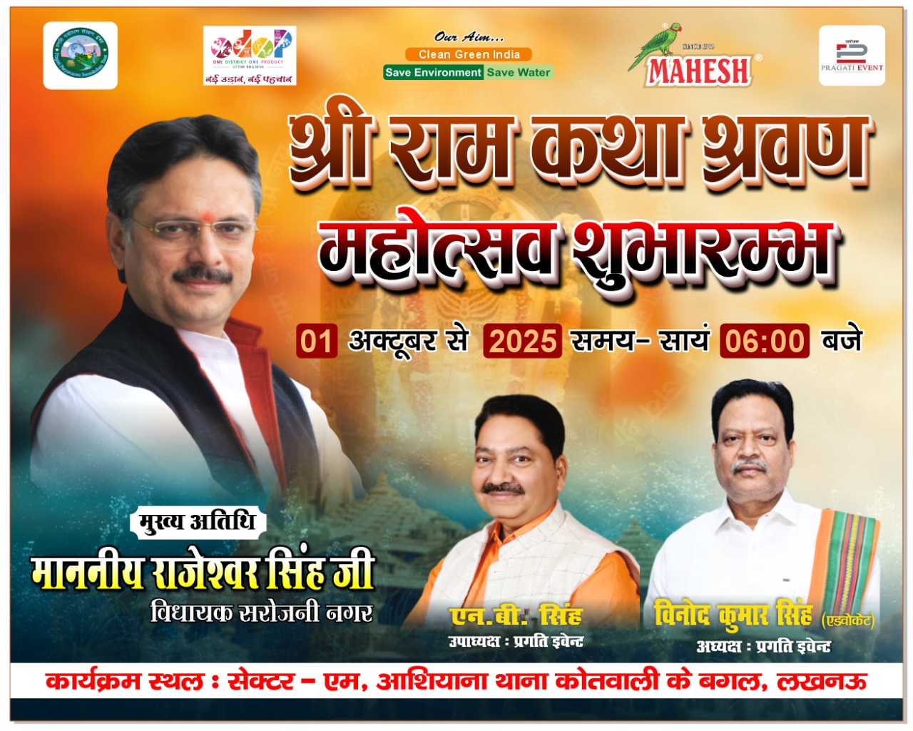 लखनऊ, 1 अक्टूबर 2025 प्रगति महोत्सव 2025 का विधिवत शुभारंभ सरोजिनी नगर के विधायक राजेश्वर सिंह ने फीता काट के किया; आयोजन समिति के अध्यक्ष विनोद कुमार सिंह एवं उपाध्यक्ष एनबी सिंह ने पौधा एवं अंग वस्त्र देकर सम्मानित किया। विधायक राजेश्वर सिंह ने पूरे महोत्सव का भ्रमण किया उन्होंने इस बात की प्रशंसा की महोत्सव में नारी सशक्तिकरण तथा नारी शक्ति मिशन को विशेष बढ़ावा दिया गया है महोत्सव में महिला उद्यमियों द्वारा राजेश्वर सिंह को बुके देकर सम्मानित किया। महोत्सव में सफाई, सजावट, सेल्फी प्वाइंट और स्टालों की प्रशंसा की तथा कहा कि प्रगति इवेंट द्वारा आयोजित होने वाले सभी महोत्सव में हर बार कुछ अलग दिखाई देता है। इसके लिए पूरी टीम को बधाई एवं साधुवाद, विधायक राजेश्वर सिंह ने महोत्सव में चल रही राम कथा का श्रवण किया तथा परम पूज्य गुरु जी स्वामी प्रद्युमन जी महाराज का आशीर्वाद प्राप्त किया। इस अवसर पर बड़ी संख्या में श्रद्धालु एवं अन्य विशिष्ट जन उपस्थित रहे।