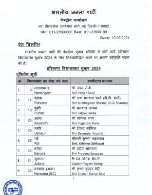 चंडीगढ़ : हरियाणा विधानसभा चुनाव 2024 के लिए बीजेपी ने 21 उम्मीदवारों की दूसरी लिस्ट जारी की. लिस्ट में दो मुस्लिम उम्मीदवारों को टिकट दिया गया है. फिरोजपुर झिरका से नसीम अहमद और पुन्हाना से एजाज खान को बीजेपी ने चुनावी मैदान में उतारा है. नारायणगढ़ से पवन सैनी चुनाव लड़ेंगे. नूह से संजय सिंह पार्टी के उम्मीदवार होंगे. लिस्ट में 2 मंत्रियों की टिकट काटी गई है. इससे पहले बीजेपी ने 67 उम्मीदवारों की पहली लिस्ट जारी की थी. बीजेपी ने अब तक 87 उम्मीदवारों के नामों की घोषणा कर दी है. केवल 3 सीटों महेंद्रगढ़, सिरसा और फरीदाबाद एनआईटी से उम्मीदवारों की घोषणा बाकी है.