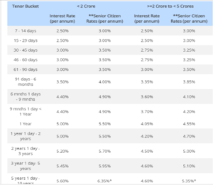 बता दें कि इससे पहले जनवरी में बैंक ने 2 साल 1 दिन से 3 साल की अवधि की FD पर 5.2 प्रतिशत, 3 साल 1 दिन से 5 साल तक की अवधि के लिए 5.4 प्रतिशत और 5 साल 1 दिन से 10 साल तक की अवधि के लिए 5.6 प्रतिशत ब्याद कर कर दी थी। चलिए, बैंक द्वारा FD पर दी जा रही मौजूदा ब्याज दर जानते हैं-