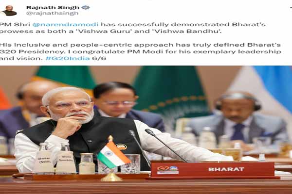 पीएम नरेंद्र मोदी ने ‘विश्व गुरु’ और ‘विश्व बंधु’ दोनों के रूप में भारत की शक्ति का सफलतापूर्वक प्रदर्शन किया है। राजनाथ सिंह ने कहा कि उनके समावेशी और जन-केंद्रित विजन ने वास्तव में भारत की जी20 प्रेसीडेंसी को परिभाषित किया है। मैं पीएम मोदी को उनके श्रेष्ठ नेतृत्व और दूरदर्शिता के लिए बधाई देता हूं।
