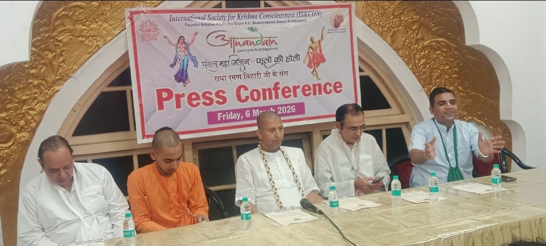 इस्कान मंदिर द्वारा 2023 से निरंतर आयोजित किये जा रहे “आनंदम” “मंगल महा मिलन” “फूलों की होली” के चतुर्थ भव्य कार्यक्रम के संदर्भ मे दिनांकः 06-03-2026 शुक्रवार को प्रेस क्लब, हजरतगंज, लखनऊ में प्रेस वार्ता का आयोजन दोपहर 03:00 बजे किया गया, जिसमें श्रीमान अपरिमेय श्याम प्रभु जी, मन्दिर अध्यक्ष, श्रीमान आनंद स्वरूप अग्रवाल प्रभु जी (चेयरमैन मंदिर निर्माण कमेटी), श्रीमान लाल बहादुर यादव प्रभु जी (वाइस चेयरमैन, फेस्टिवल कमेटी) श्रीमान भोक्ताराम प्रभु जी (वॉइस प्रेसीडेंट) एवं श्रीमान मधुस्मिता प्रभु जी (वॉइस प्रेसीडेंट) उपस्थित रहे।
