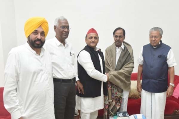 हैदराबाद। तेलंगाना के मुख्यमंत्री के. चंद्रशेखर राव ने बुधवार को तीन राज्यों के मुख्यमंत्रियों और राजनीतिक दलों के नेताओं के साथ ब्रेकफास्ट मीटिंग की। दिल्ली के मुख्यमंत्री अरविंद केजरीवाल, पंजाब के मुख्यमंत्री भगवंत मान, केरल के मुख्यमंत्री पिनाराई विजयन, उत्तर प्रदेश के पूर्व मुख्यमंत्री अखिलेश यादव, भाकपा के राष्ट्रीय महासचिव डी. राजा और अन्य नेताओं ने मुख्यमंत्री के आधिकारिक आवास प्रगति भवन में ब्रेकफास्ट मीटिंग में हिस्सा लिया।