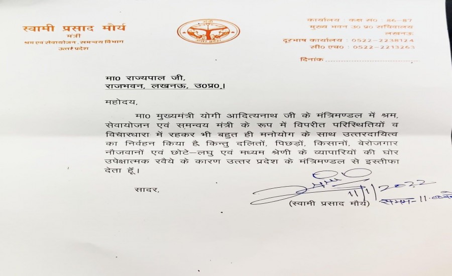 स्वामी प्रसाद मौर्य ने राजपाल को लिखते हुए कहा- माननीय मुख्यमंत्री योगी आदित्यनाथ जी के मंत्रिमंडल में श्रम एवं सेवायोजन व समन्वय मंत्री के रूप में विपरीत परिस्थितियों व विचारधारा में रहकर भी बहुत ही मनोयोग के साथ उत्तरदायित्व का निर्वहन किया है किंतु दलितों, पिछड़ों, किसानों बेरोजगार नौजवानों एवं छोटे- लघु एवं मध्यम श्रेणी के व्यापारियों की घोर उपेक्षात्मक रवैये के कारण उत्तर प्रदेश के मंत्रिमंडल से मैं इस्तीफा देता हूं.