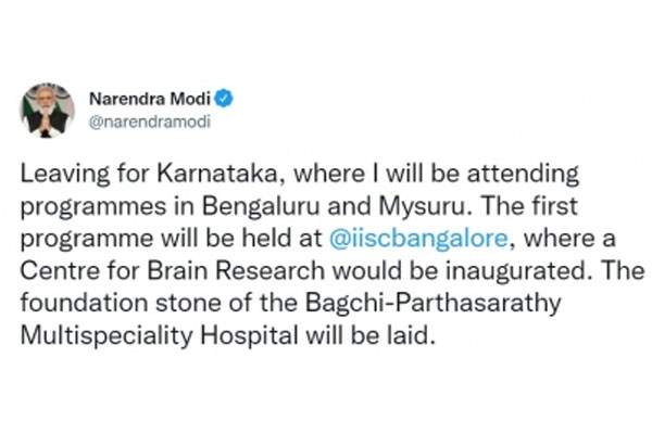 नई दिल्ली । प्रधानमंत्री नरेंद्र मोदी कर्नाटक की दो दिवसीय यात्रा के लिए रवाना हुए, जहां वह 27,000 करोड़ रुपये से अधिक की कई रेल और सड़क बुनियादी ढांचा परियोजनाओं का उद्घाटन और शिलान्यास करेंगे और मैसूर पैलेस मैदान में एक सामूहिक योग कार्यक्रम में भाग लेंगे। ट्वीट्स की एक श्रृंखला में प्रधानमंत्री मोदी ने कहा, “कर्नाटक के लिए प्रस्थान, जहां मैं बेंगलुरु और मैसूर में कार्यक्रमों में भाग लूंगा। पहला कार्यक्रम एटदरेट आईआईएससी बेंगलुरु में आयोजित किया जाएगा, जहां एक सेंटर फॉर ब्रेन रिसर्च का उद्घाटन किया जाएगा। बागची-पार्थसारथी मल्टीस्पेशलिटी अस्पताल की आधारशिला भी रखी जाएगी।”