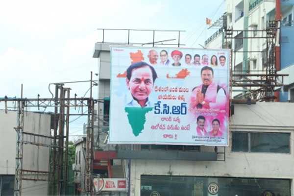 भारत के नक्शे के साथ होर्डिग और तेलंगाना के मुख्यमंत्री और टीआरएस नेता के. चंद्रशेखर राव की तस्वीर टीआरएस के कुछ स्थानीय नेताओं ने लगाई थी।