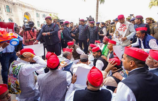 यूपी : विधानमंडल के बजट सत्र से पहले शिवपाल के नेतृत्व में सपा विधायकों का प्रदर्शन